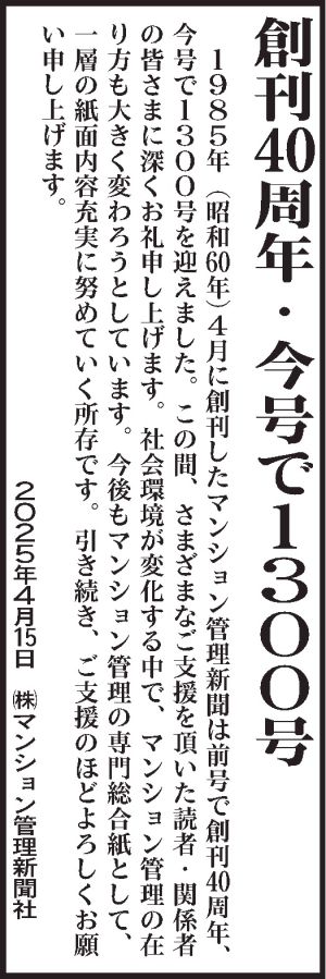 2025年4月15日 ㈱マンション管理新聞社 , 1985年(昭和60年)4月に創刊したマンション管理新聞は前号で創刊40周年、今号で1300号を迎えました。この間、さまざまなご支援を頂いた読者・関係者の皆さまに深くお礼申し上げます。社...